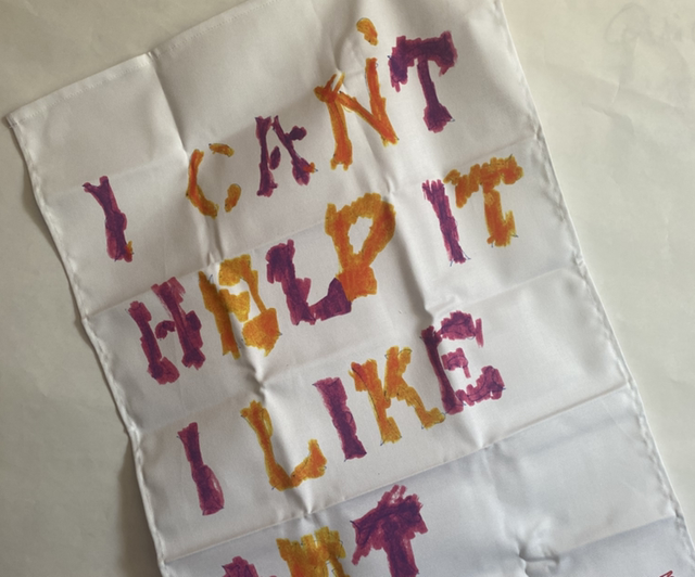 Tea Towel - cotton with orange and purple text ‘ I can’t help it I like art’ by Poppy, packaged with belly band idea for gift.